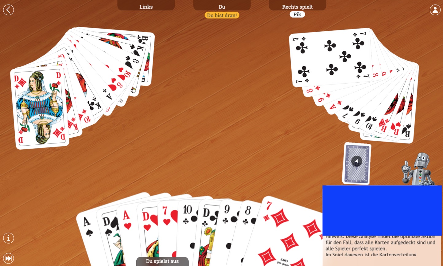 Der Pik Bube ist der erste Versuch, ein Aufspiel des Mannes mit den Karos zu verhindern. Er mißlingt und auch das Trumpf Ass wandert zur Gegenpartei.