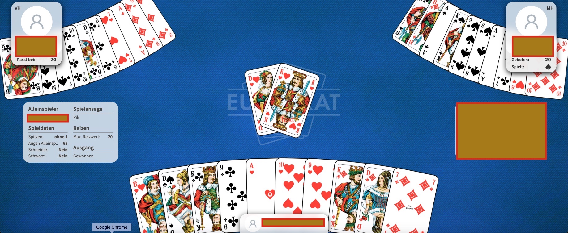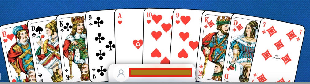 Mittelhand (im Bild rechts) wird Besitzer und findet 2 x Herz. Er drückt Karo 10 und Kreuz 7 und annonciert ein Pikspiel. Im ersten Stich sehen wir Herz 7, Herz König und Herz Ass