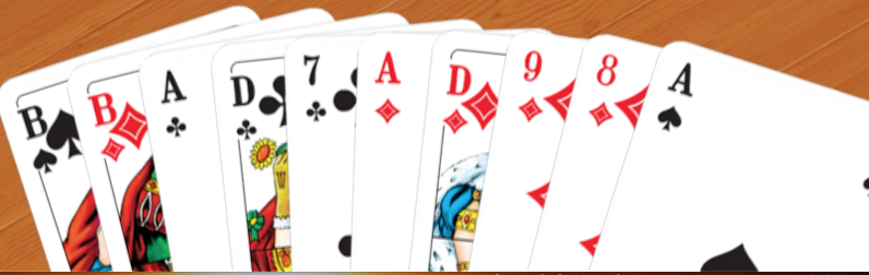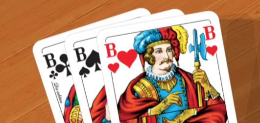 Eine Karte mit 9 Kinback-Punkten. Auch hier spielen wir mit einer Wahrscheinlichkeit von 30% gegen mindestens vier Trumpf und mit einer Wahrscheinlichkeit von 60% gegen 3 oder 4 Kreuzer in einer Hand.